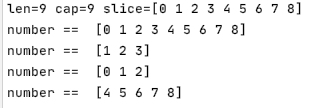 fmt.Printf("len=%d cap=%d         slice=%v\n",len(number),cap(number),number)