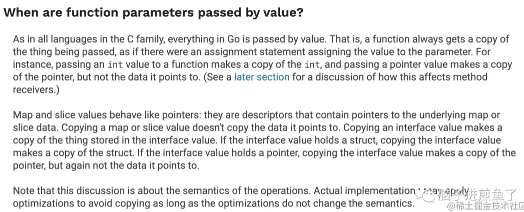 本部分引用 Go 官方 FAQ 的 “When are function parameters passed by value?”,内容如下。