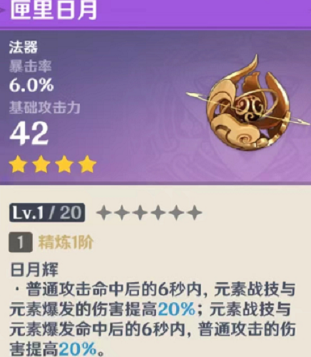 赌狗不出谁与争锋?匣里日月泛用性也是非常非常高的,法器主副c都可以选择,高贵的双暴词条能大大缓解圣遗物压力,武器效果能全面提升元素爆发,元素战技和普攻伤害,精5达到40%的增幅额度,触发机制也非常简单,相较于四风原典苛刻的触发需求,匣里日月真的物超所值!