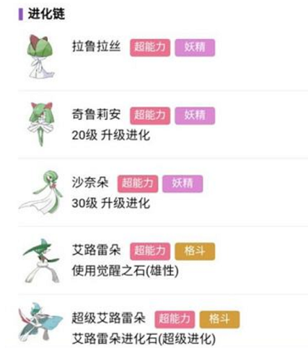 进化链:拉鲁拉丝→奇鲁莉安→沙奈朵→艾露雷朵(雄性觉醒之石)→超级艾露雷朵