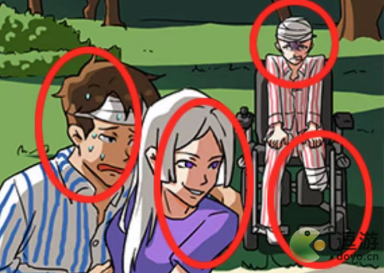 5、最后将三个人移动到场景,点击满头大汗的男人、白发女人、轮椅上的人、断了的腿
